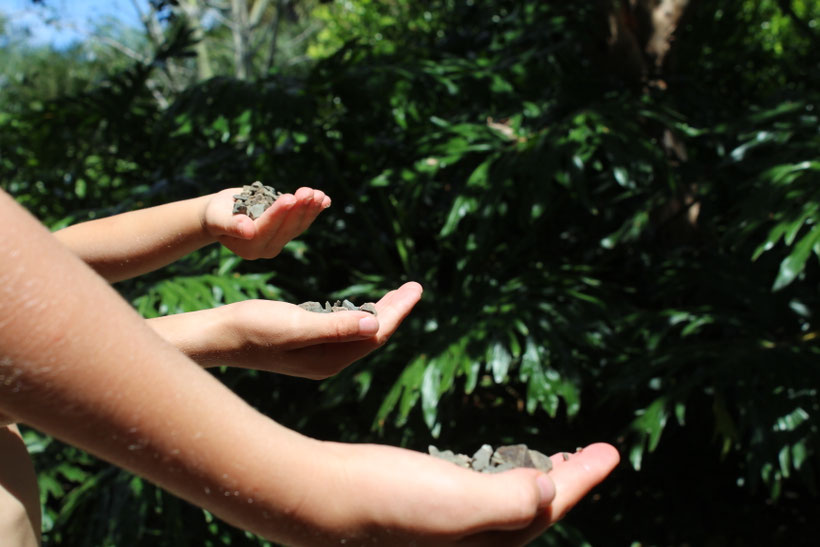 Als Gleichnis nehmen wir eine Handvoll Kieselsteine – jeder Stein steht für einen unserer Schätze, etwa unser Auto, Haus, Job, aber auch unsere Kinder, die Freunde und tiefe Wertvorstellungen. Wir halten die Steinchen fest umschlungen in unserer Faust, um ja keines fallen zu lassen. Unsere Hand verkrampft sich immer stärker und beginnt zu schmerzen. Unsere Kräfte lassen langsam nach und wir werden gezwungen, die Faust ein wenig zu lösen. Das wollen wir jedoch nicht wahrhaben, da wir fürchten, dass uns die Steinchen entgleiten und zu Boden fallen. Wir umklammern sie noch stärker, was zu erneuten Schmerzen führt. Die Lösung liegt darin, die Handfläche nach oben zu drehen. Wir dürfen das simple Wunder erleben, unsere Hand zu öffnen können und alle Kieselsteine ganz leicht auf der flachen Hand zu tragen - ohne daran festzuhalten! Eine einfache Drehung vermag unser Leben komplett zu verändern.